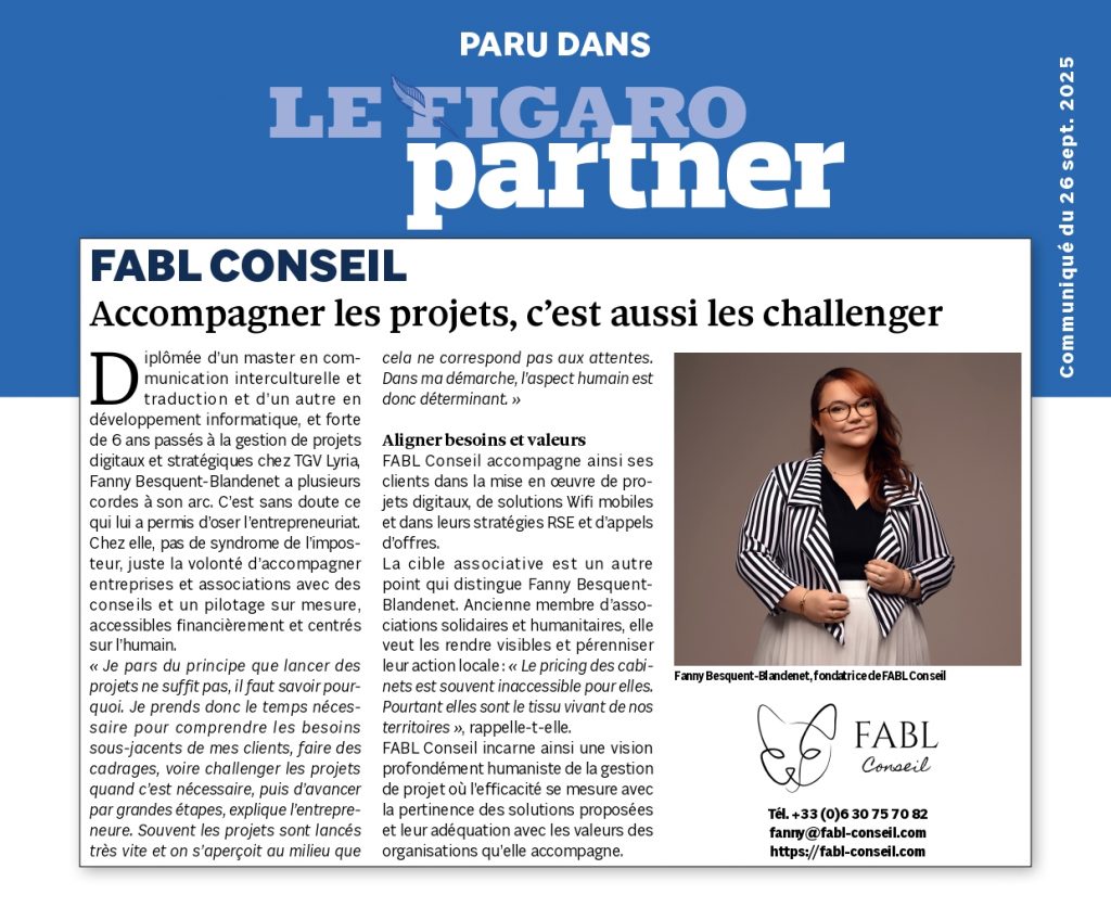 Aujourd’hui, je prends un moment pour partager une reconnaissance qui me touche particulièrement : mon parcours d’entrepreneure et la création de FABL Conseil sont présents dans Le Figaro Partner Solutions Entreprises. Cette visibilité est l’occasion idéale de revenir sur ce qui m’a menée à l’entrepreneuriat et sur la vision qui guide chacune de mes missions.